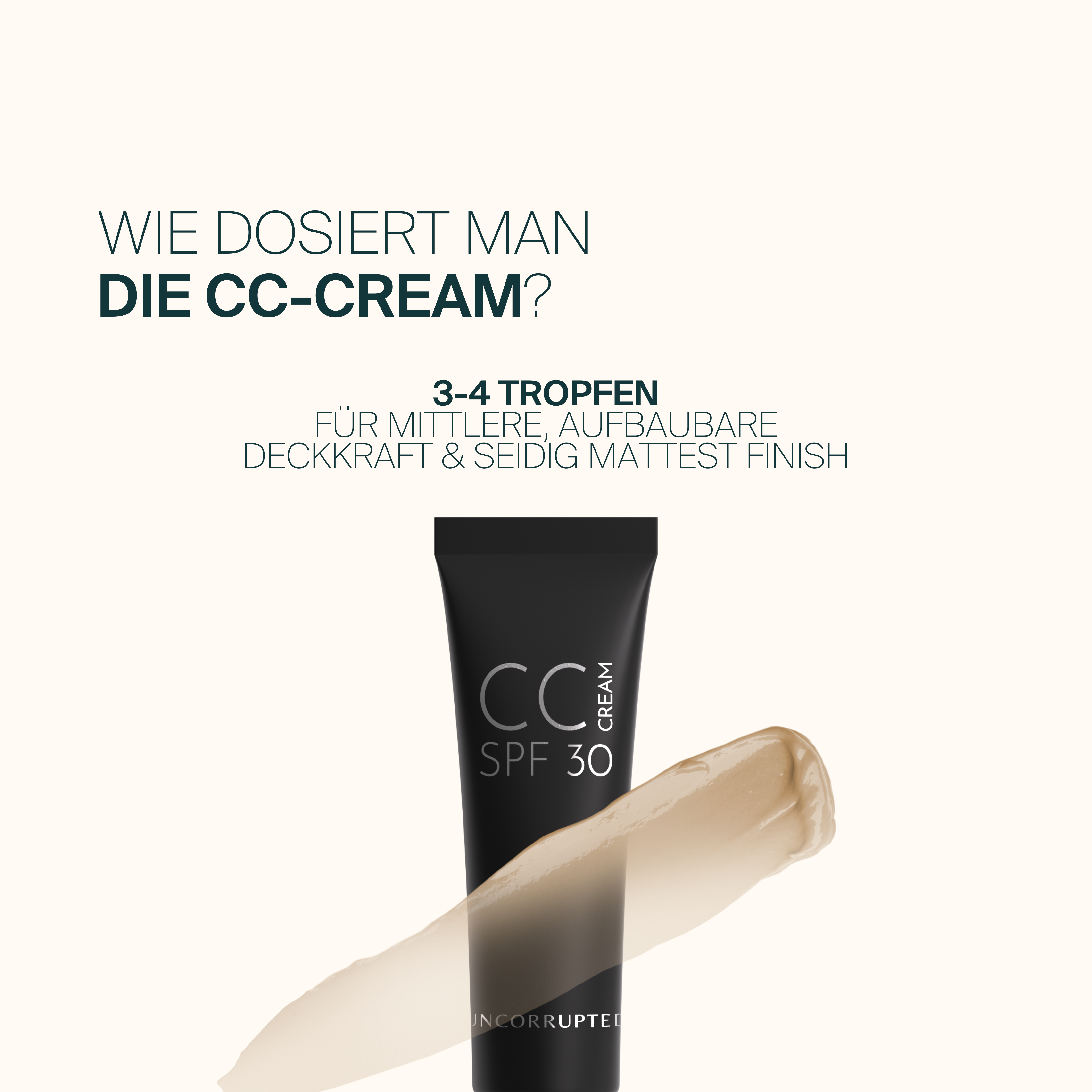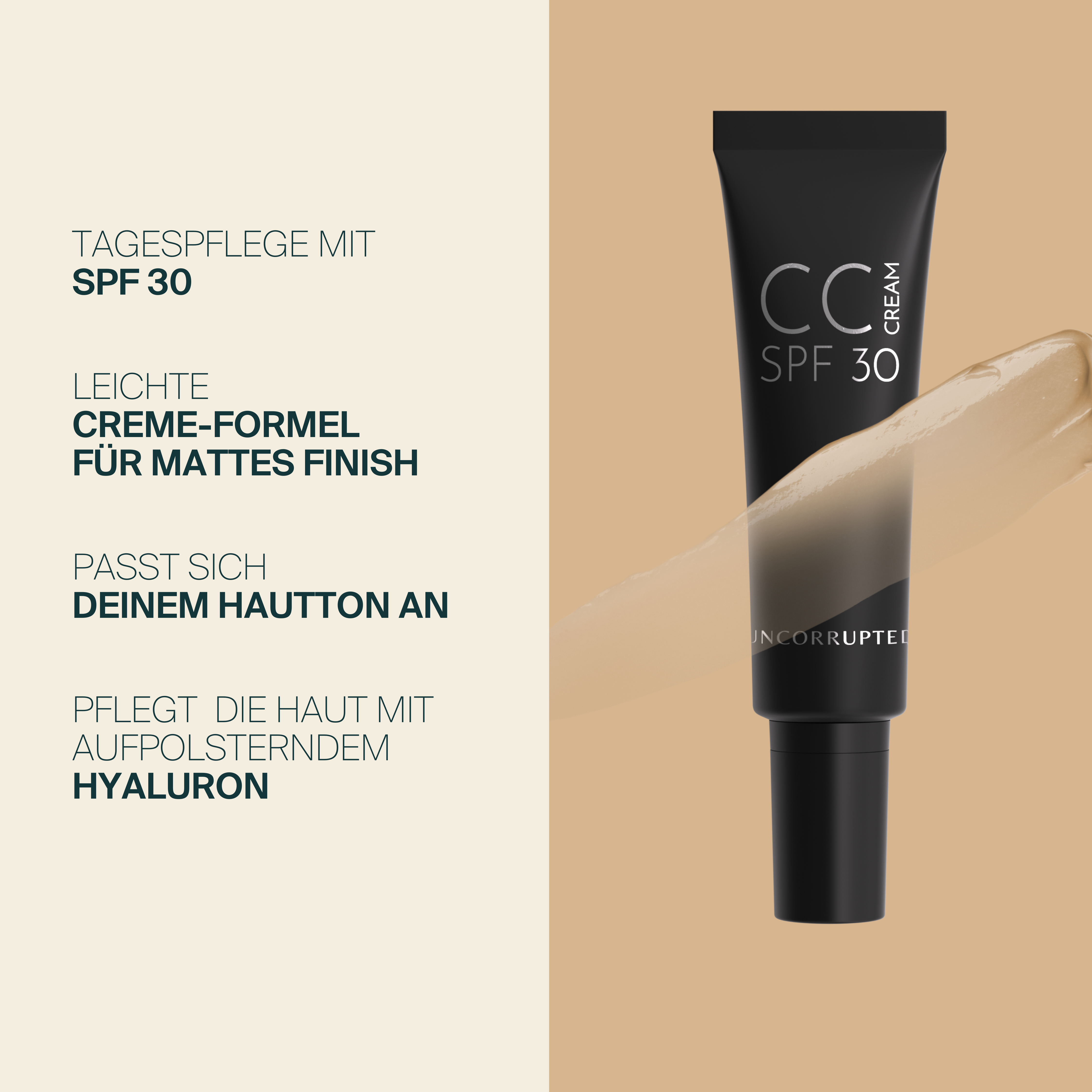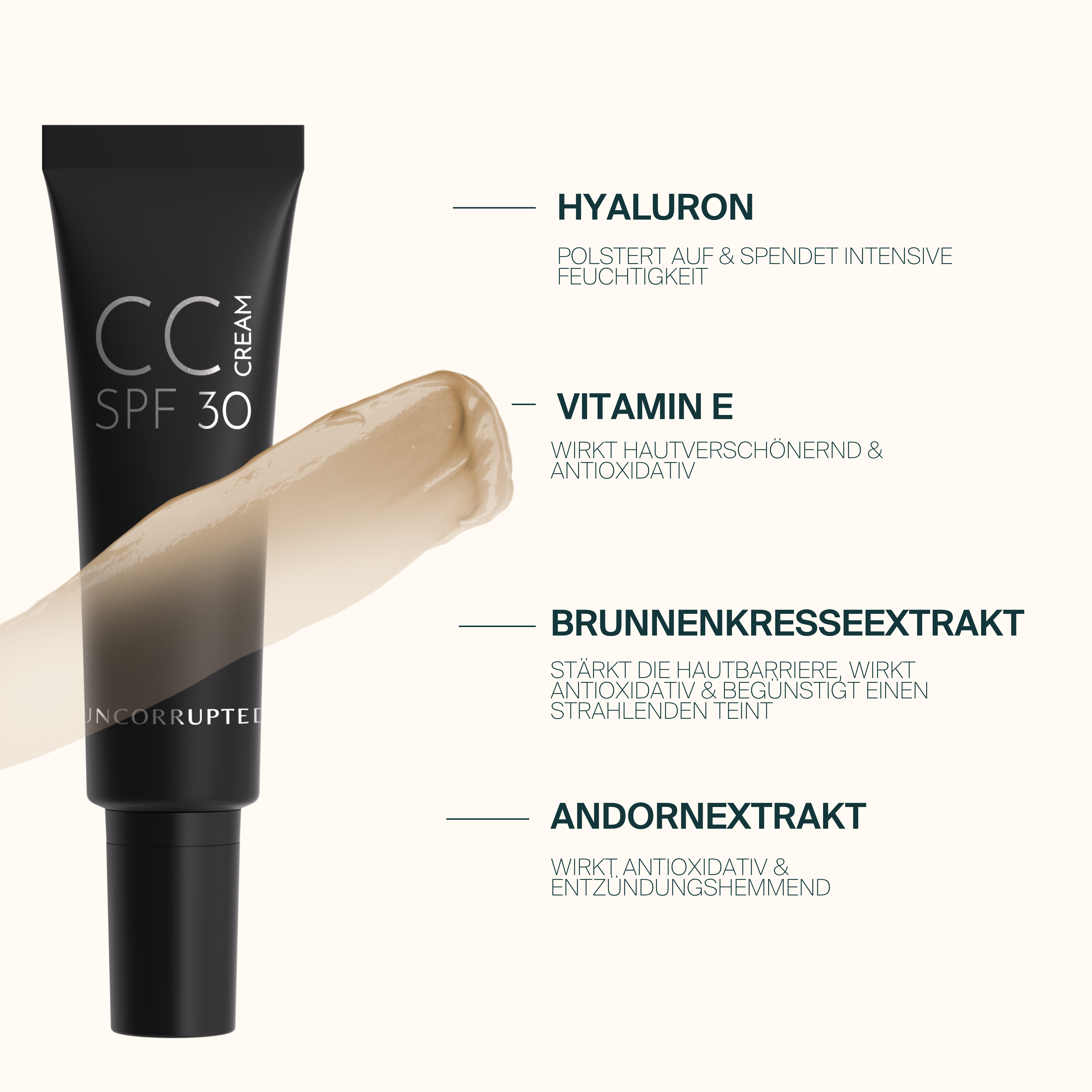 Entdecke unsere multifunktionale Tagespflege - eine wahre Verwandlung für den Teint! Die smarte Formel gleicht nicht nur den Hautton aus, pflegt die Haut intensiv und schützt sie mit LSF 30 vor lichtbedingter, vorzeitiger Hautalterung. Durch die Kombination von feuchtigkeitspendendem und aufpolsterndem Hyaluron, hautverschönerndem Vitamin E und antioxidativem Brunnenkressen- sowie Andornextrakt wird Hautbarriere gestärkt und die Haut verwöhnt. Die speziellen Farbpigmente brechen das Licht auf wundersame Weise, verleihen der Haut so sofort einen Weichzeichnereffekt. Sie passen sich dem individuellen Hautton ebenmäßig an. Das Ergebnis? Ein makelloses, seidig-mattes Finish mit einem natürlichen Glow, der die Schönheit deiner zum Strahlen bringt. Unsere CC Cream gibt es derzeit in drei Shades, die auf helle bis mittlere Hauttöne abgestimmt sind. Wir arbeiten daran, unser Sortiment zu erweitern, um noch mehr Hauttypen gerecht zu werden.