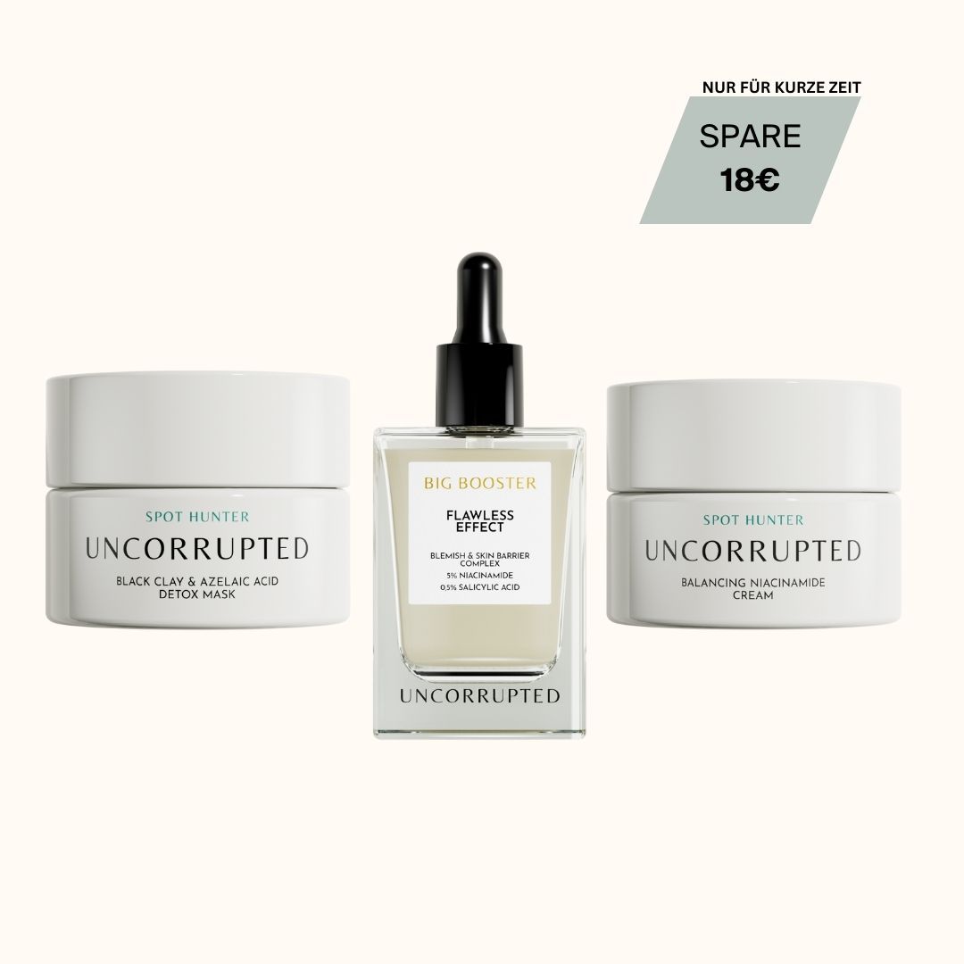 Fight blemished, oily skin and blackheads with these power products. The powerful ingredients will give you visible results in no time! ✓ The kit consists of Black Clay & Azelaic Acid Detoxifying Mask: For a radiant complexion and youthful glow, this detoxifying activated charcoal mask contains 2% Azelaic Acid, AHA, Zinc & Black Clay. ✓ Flawless Effect: Highly concentrated booster drops for flawless, radiant skin with 5% Niacinamide, 0.5% Salicylic Acid (BHA) and the unique Blemish & Skin Barrier Complex. ✓ Balancing Niacinamide Cream: A mattifying moisturiser with 4% niacinamide & our unique Pro-Pure Complex for a beautified complexion and a radiant, velvety matte finish with no greasy residue.