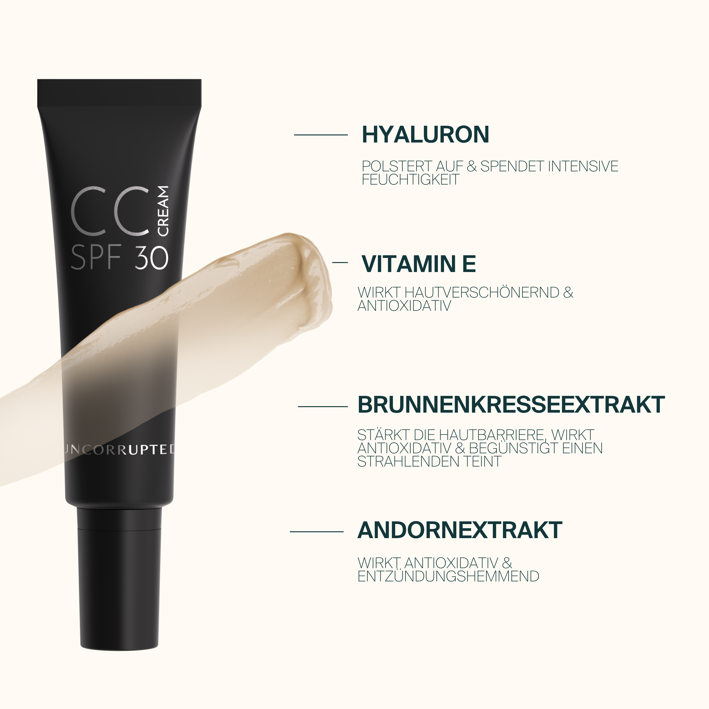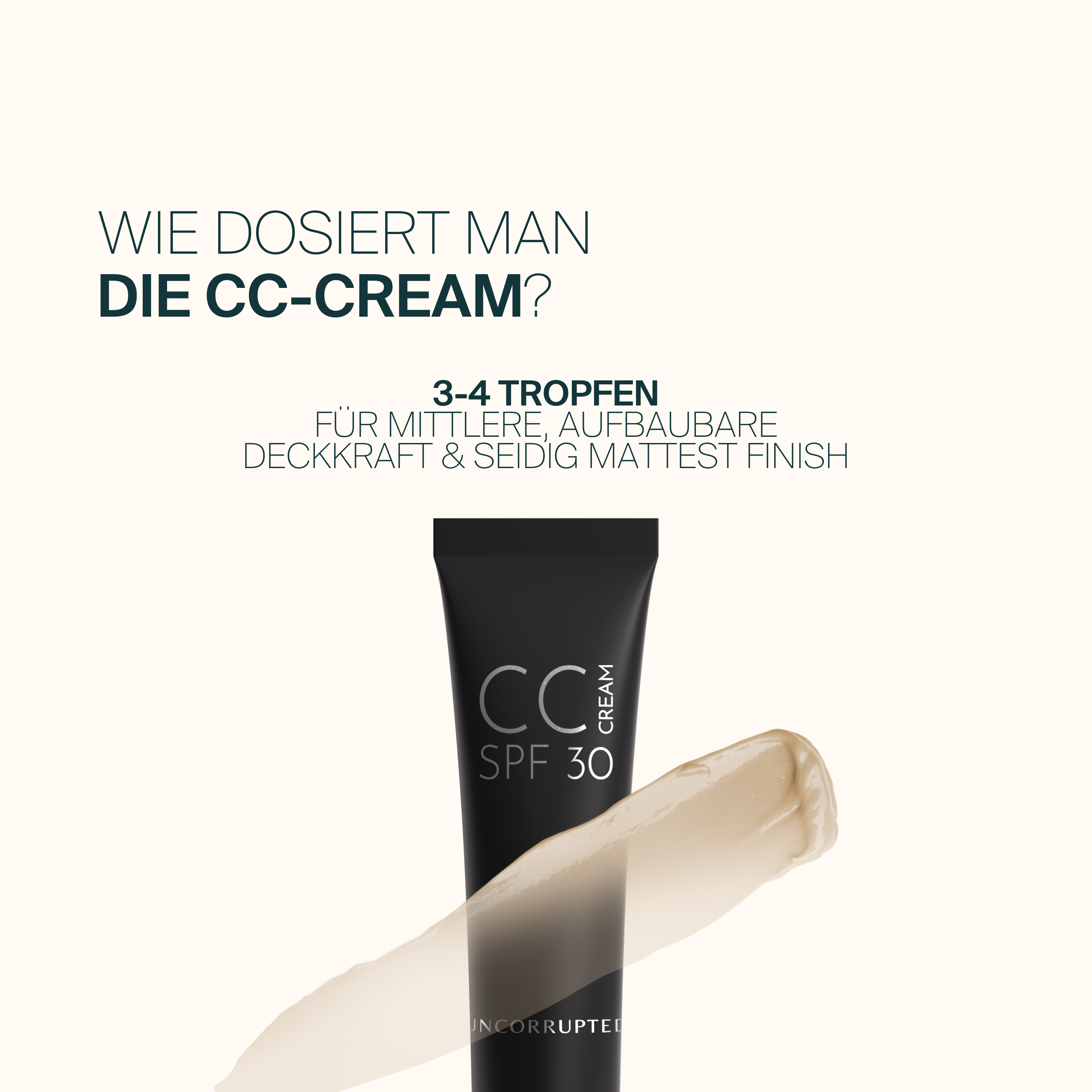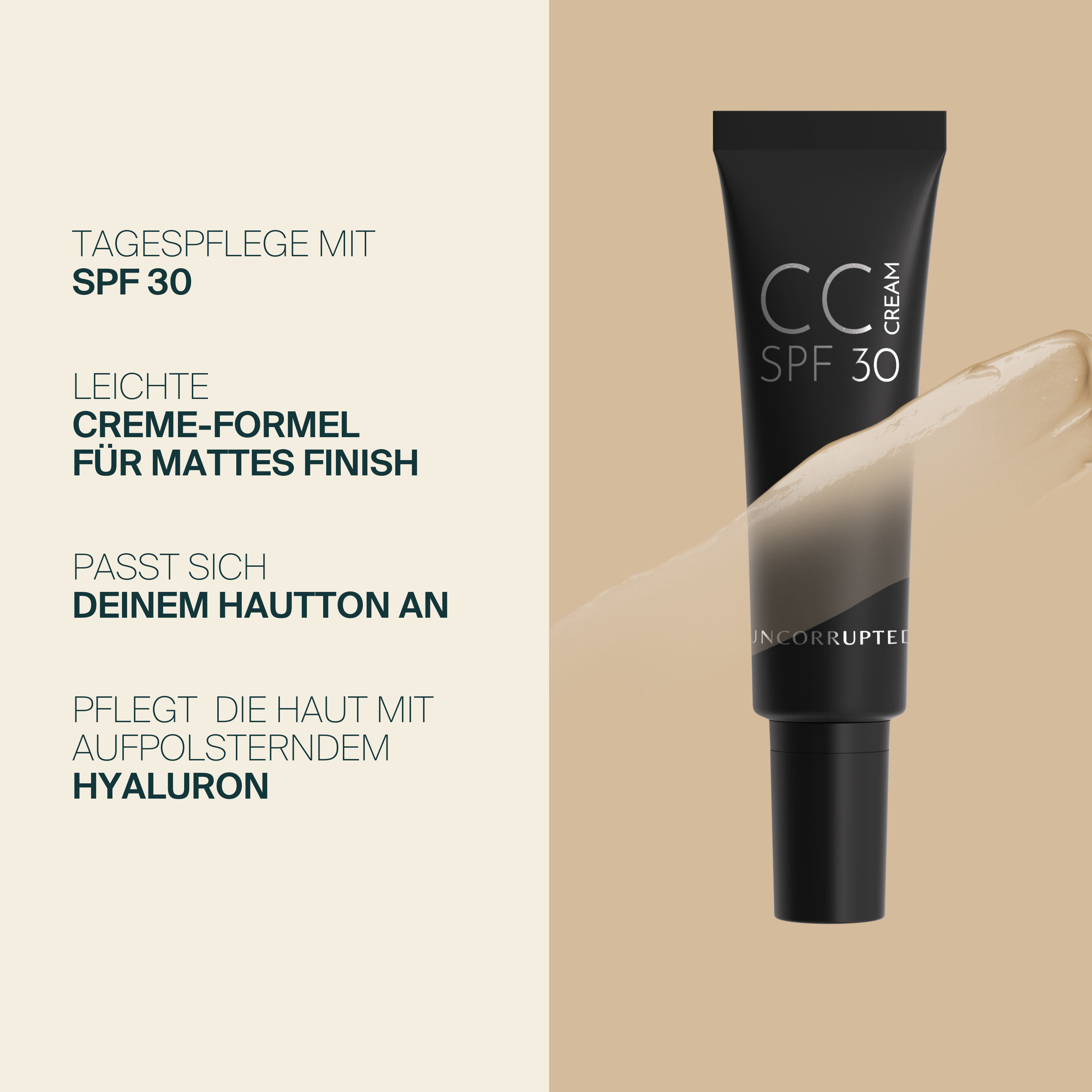 Entdecke unsere multifunktionale Tagespflege - eine wahre Verwandlung für den Teint! Die smarte Formel gleicht nicht nur den Hautton aus, pflegt die Haut intensiv und schützt sie mit LSF 30 vor lichtbedingter, vorzeitiger Hautalterung. Durch die Kombination von feuchtigkeitspendendem und aufpolsterndem Hyaluron, hautverschönerndem Vitamin E und antioxidativem Brunnenkressen- sowie Andornextrakt wird Hautbarriere gestärkt und die Haut verwöhnt. Die speziellen Farbpigmente brechen das Licht auf wundersame Weise, verleihen der Haut so sofort einen Weichzeichnereffekt. Sie passen sich dem individuellen Hautton ebenmäßig an. Das Ergebnis? Ein makelloses, seidig-mattes Finish mit einem natürlichen Glow, der die Schönheit deiner zum Strahlen bringt. Unsere CC Cream gibt es derzeit in drei Shades, die auf helle bis mittlere Hauttöne abgestimmt sind. Wir arbeiten daran, unser Sortiment zu erweitern, um noch mehr Hauttypen gerecht zu werden.