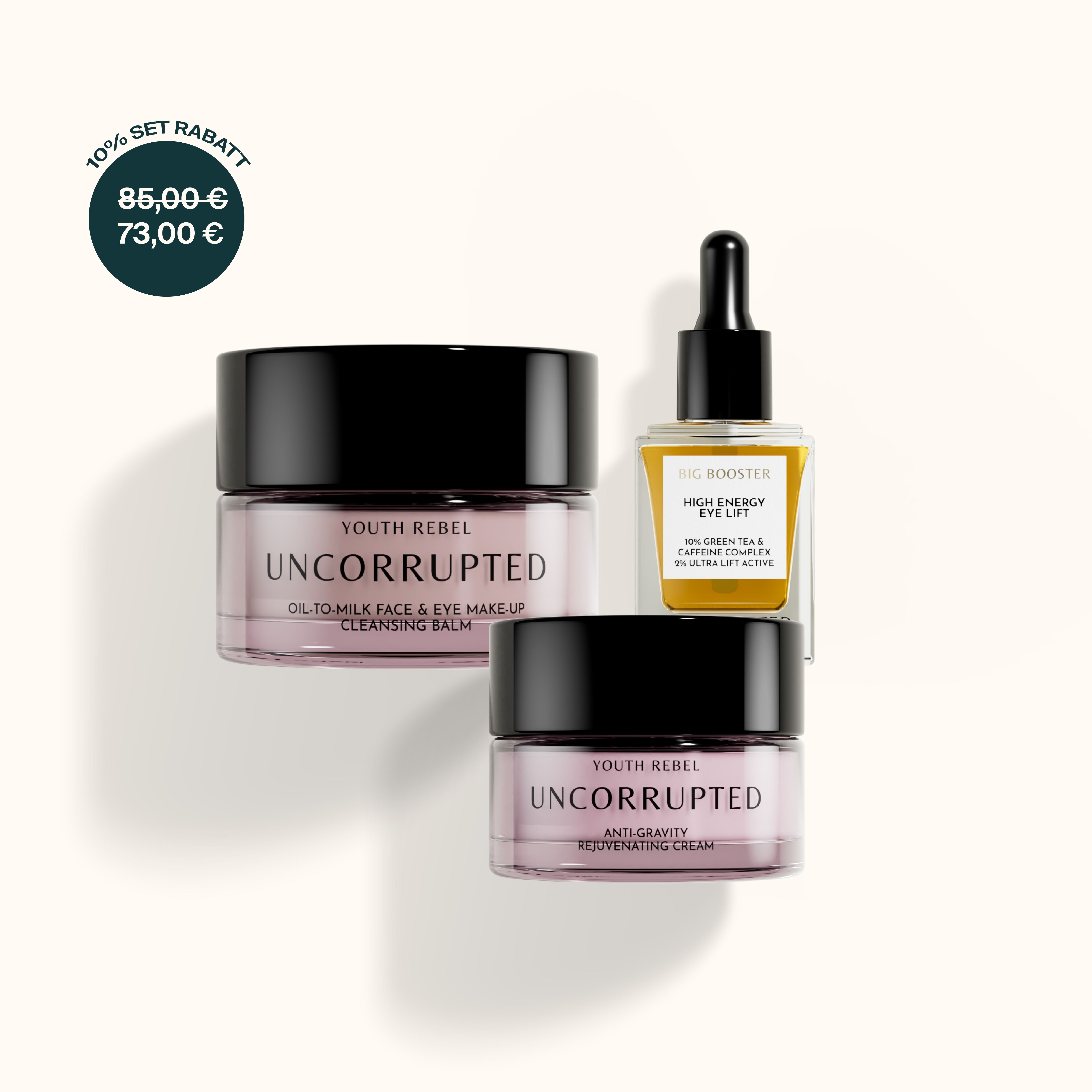 Ein Set aus drei Augenpflege-Experten für sanfte Augen-Make-up Entfernung, gegen Anzeichen von Müdigkeit & mit sichtbarem Lifting-Effekt. Set bestehende aus: ✓ Milder 3-Phasen Reinigungsbalm für die tägliche Make-up Entfernung und Reinigung, 50ml ✓ Leistungsstarke Wirkstoff-Booster-Drops für die Augenpartie mit 10% Grüntee-Koffein-Komplex und Ultra-Lift-Aktivstoff, 15ml ✓ Anti-Aging Augencreme mit pflanzlichem Kollagen, 15ml