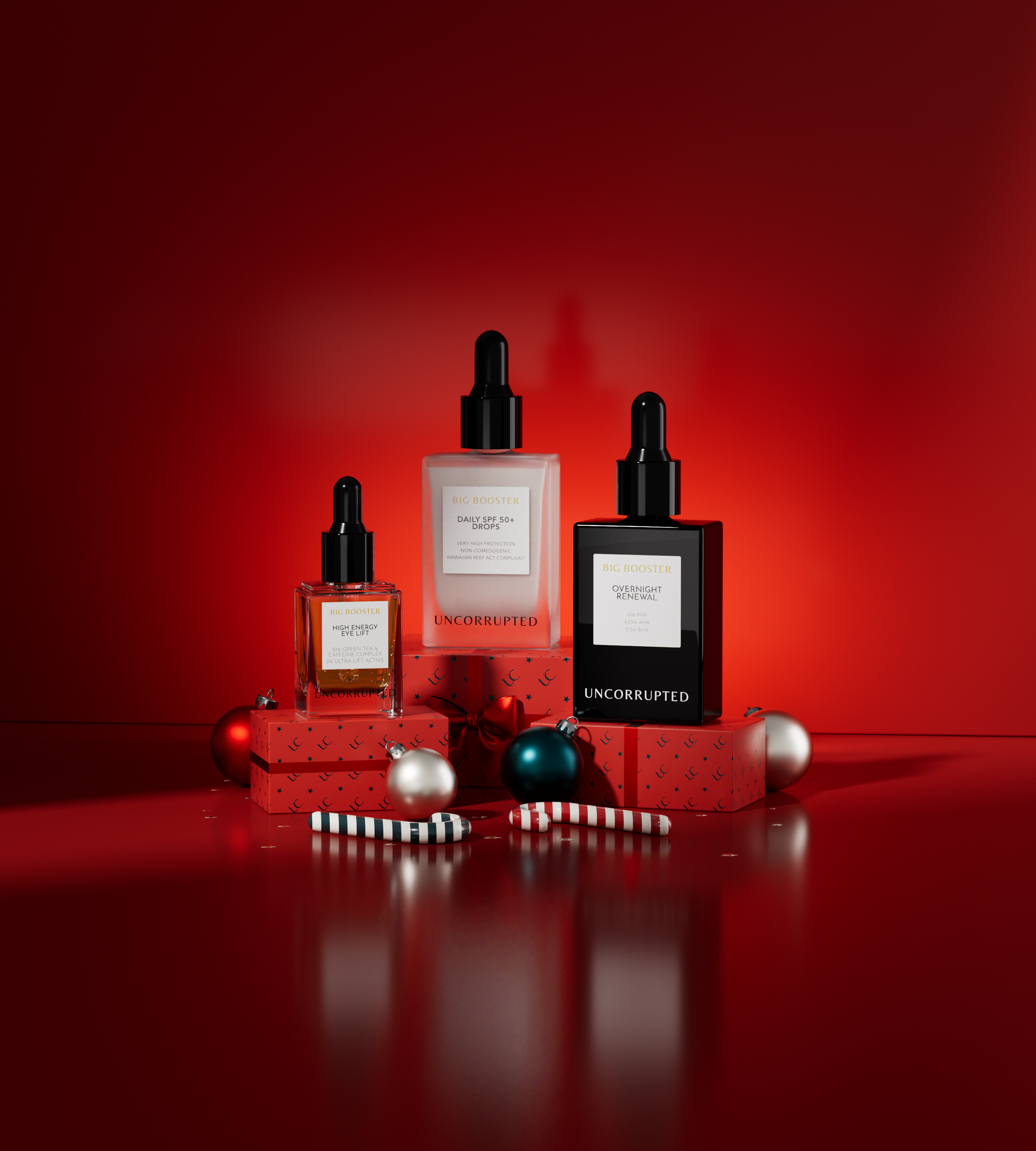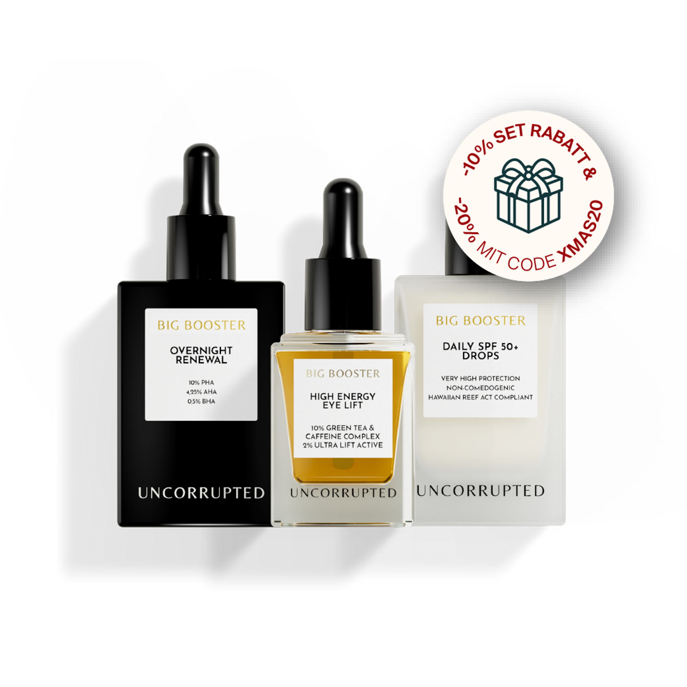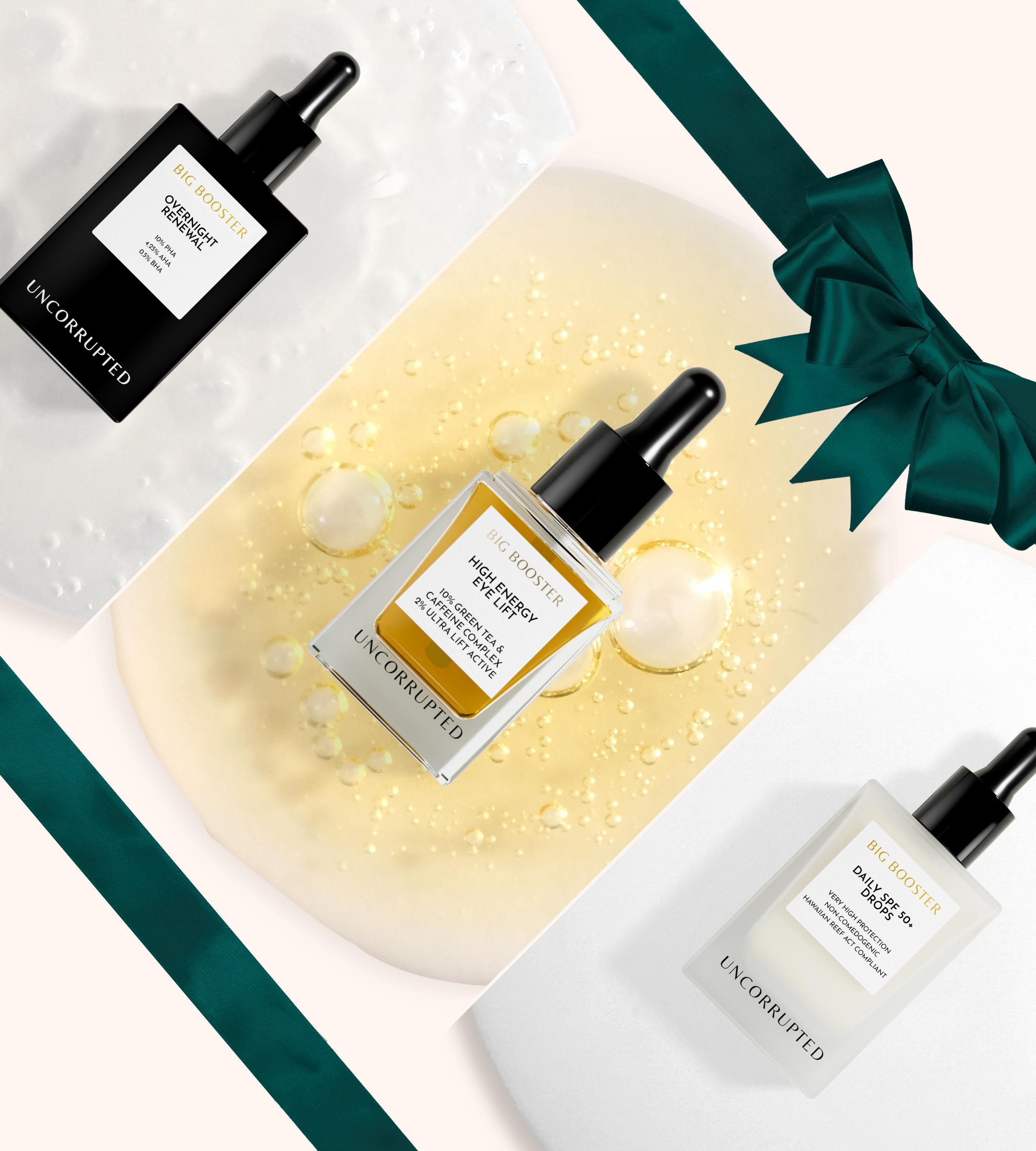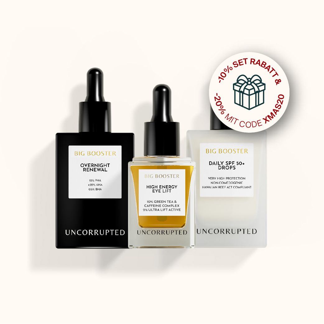 Beschenke jetzt dich selbst oder deine Liebsten mit unseren absoluten Booster-Bestsellern im exklusiven Weihnachts-Set! Set bestehend aus: ✓ Sanftes Peeling mit 10% PHA, 4,25% AHA, 0,5% BHA, 30ml ✓ Leistungsstarke Wirkstoff-Booster-Drops für die Augenpartie mit 10% Grüntee-Koffein-Komplex, 15ml ✓ Ultraleichte Multi-use SPF50+ Drops für einzelne Anwendung oder kombiniert mit Lieblings-Pflege & Make-up, 30ml
